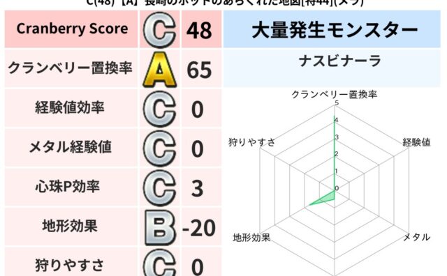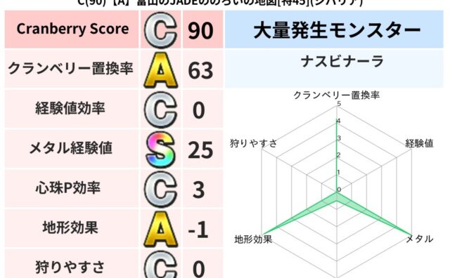 地図判定結果 C(90)【A】富山のJADEののろいの地図[特45](ジバリア) クランベリーボット判定結果の詳細クランベリースコア:90クランベリー置換率:63%大量発生モンスター:ナスビナーラジバリア超耐性(1%)こころ道 完全一致モンスターどくイモムシニンジャ(波道Lv5)がいこつ魔剣士(共通Lv1)ストーンマンゴ... 2023/12/22 14:32 地図判定結果