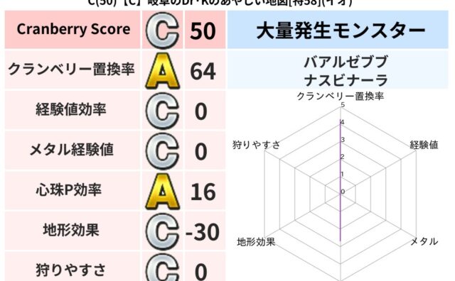 クランベリーボット判定結果の詳細クランベリースコア:74クランベリー置換率:64%大量発生モンスター:バアルゼブブ,ナスビナーライオ超耐性(0%)こころ道 完全一致モンスターキャットフライ: ニンジャ(共通Lv1)デビルアーマー: 大神官(...
