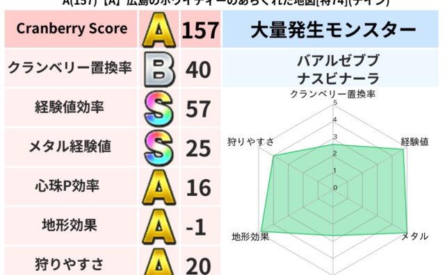 スコアA A(157)【A】広島のホワイティーのあらくれた地図[特74](デイン) クランベリーボット判定結果の詳細クランベリースコア157クランベリー置換率40%大量発生モンスターバアルゼブブ,ナスビナーラ超耐性デイン(1%)系統狩りけもの系75%こころ道 完全一致モンスターねこまどうニンジャ(風道Lv5)リカントマムル... 2025/06/02 21:03 スコアA地図判定結果