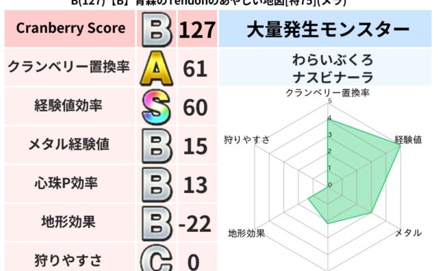 地図判定結果 B(127)【B】青森のTendonのあやしい地図[特75](メラ) クランベリーボット判定結果の詳細クランベリースコア:127クランベリー置換率:61%大量発生モンスター:わらいぶくろ,ナスビナーラメラ超耐性(18%)こころ道 完全一致モンスターみならいあくまニンジャ(風道Lv5)しのさそり大神官(祈道Lv... 2025/04/28 22:33 地図判定結果