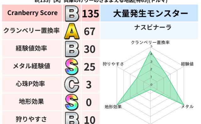 地図判定結果 B(135)【A】兵庫のけりーのさまよえる地図[特65](ドルマ) クランベリーボット判定結果の詳細クランベリースコア:135クランベリー置換率:67%大量発生モンスター:ナスビナーラドルマ超耐性(0%)こころ道 完全一致モンスターみならいあくまニンジャ(風道Lv5)さまようよろいゴッドハンド(守護道Lv5... 2025/05/15 18:11 地図判定結果