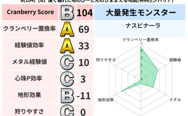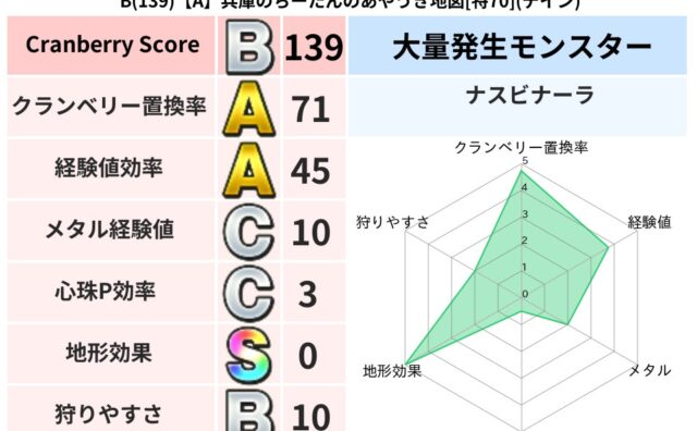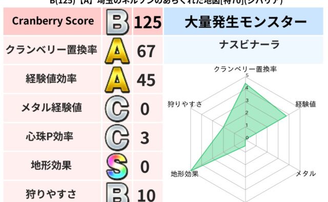 地図判定結果 B(144)【C】千葉のリーヤのささやかな地図[特66](ギラ) クランベリーボット判定結果の詳細クランベリースコア:144クランベリー置換率:48%大量発生モンスター:ナスビナーラギラ超耐性(0%)系統狩り(41%)こころ道 完全一致モンスタースカルガルー: ドラゴン(竜道Lv5)ヘルボックル: 魔剣士... 2025/03/25 10:50 地図判定結果