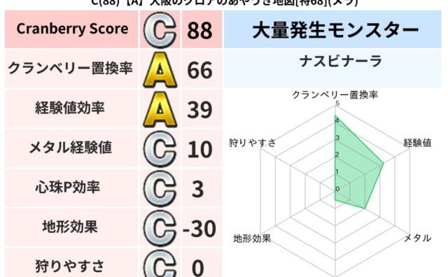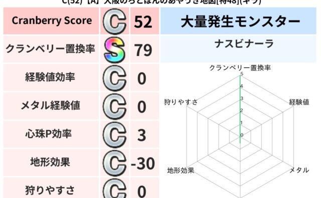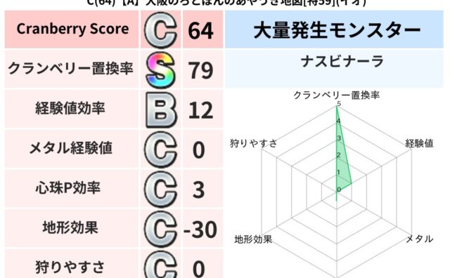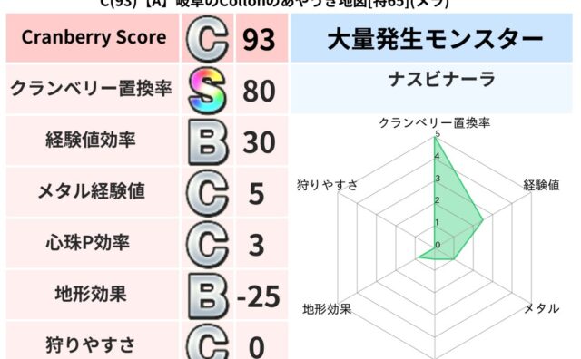 地図判定結果 C(93)【A】岐阜のCollonのあやうき地図[特65](メラ) クランベリーボット判定結果の詳細クランベリースコア:93クランベリー置換率:80%大量発生モンスター:ナスビナーラメラ超耐性(21%)こころ道 完全一致モンスターしのどれいゴッドハンド(守護道Lv5),大魔導士(魔力道Lv5)かっちゅうアリ... 2025/02/16 15:58 地図判定結果置換率S