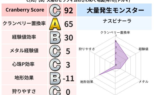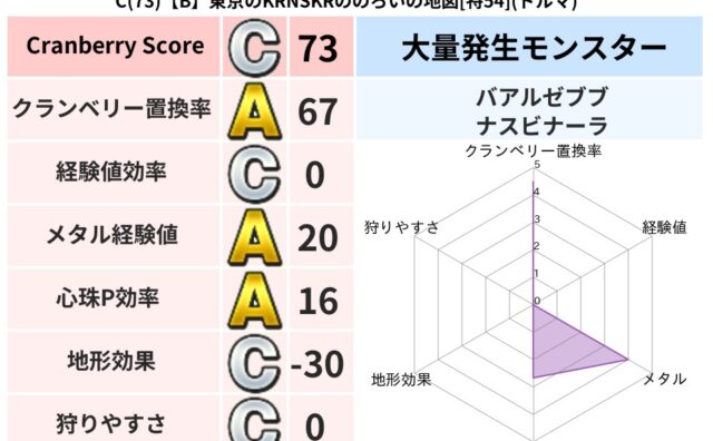 クランベリーボット判定結果の詳細クランベリースコア:84クランベリー置換率:61%大量発生モンスター:だいおうキッズ,ナスビナーラジバリア超耐性(46%)こころ道 完全一致モンスターキャットフライニンジャ(共通Lv1)がいこつ魔剣士(共通L...