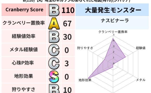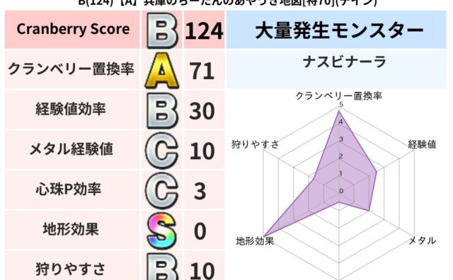 クランベリーボット判定結果の詳細クランベリースコア:144クランベリー置換率:48%大量発生モンスター:ナスビナーラギラ超耐性(0%)系統狩り(41%)こころ道 完全一致モンスタースカルガルー: ドラゴン(竜道Lv5)ヘルボックル: 魔剣士...