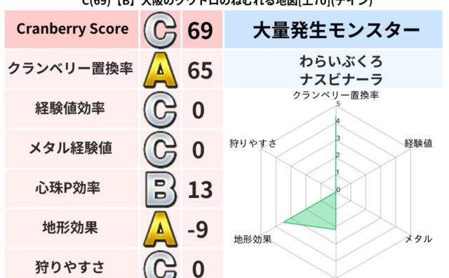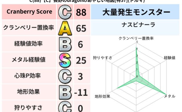 地図判定結果 C(86)【A】神奈川のマッシュのあやうき地図[特58](ギラ) クランベリーボット判定結果の詳細クランベリースコア:86クランベリー置換率:64%大量発生モンスター:ナスビナーラギラ超耐性(0%)こころ道 完全一致モンスターパペットマン: 天地雷鳴士(天道Lv5)ストーンマン: ゴッドハンド(守護道Lv... 2024/07/20 05:45 地図判定結果