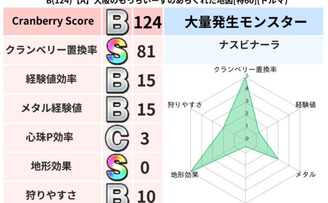 地図判定結果 B(124)【A】大阪のもっちいーずのあらくれた地図[特60](ドルマ) クランベリーボット判定結果の詳細クランベリースコア124クランベリー置換率81%大量発生モンスターナスビナーラ超耐性ドルマ(0%)こころ道 完全一致モンスターどくろあらいゴッドハンド(守護道Lv5)かっちゅうアリ魔人(共通Lv1)おおさそり... 2024/10/09 13:21 地図判定結果置換率S