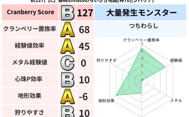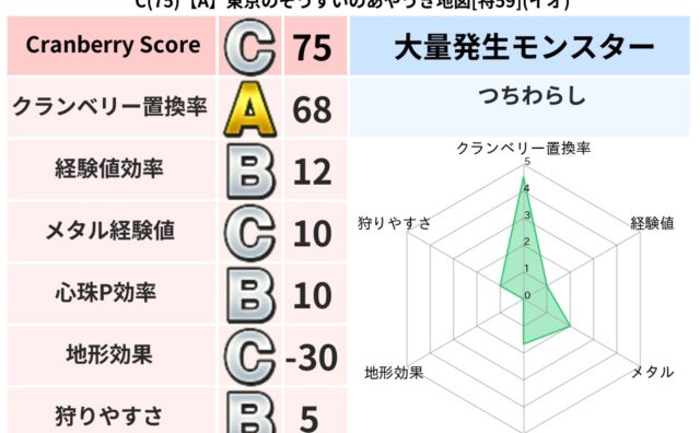 クランベリーボット判定結果の詳細クランベリースコア:75クランベリー置換率:68%大量発生モンスター:つちわらしイオ超耐性(44%)超耐性・弱耐性なし:バギこころ道 完全一致モンスターヘルボックル魔剣士(魔道Lv30)かっちゅうアリ魔人(共...