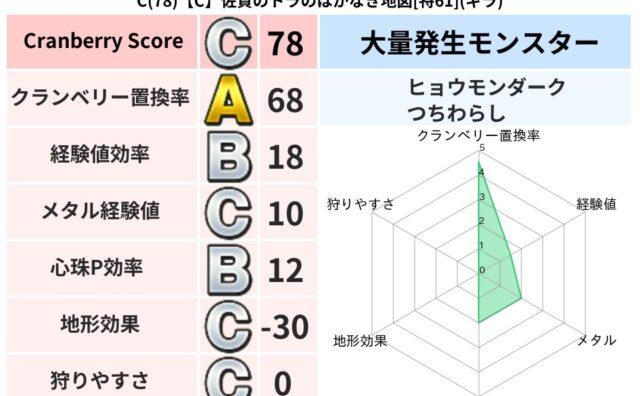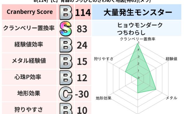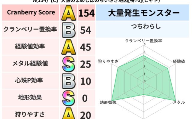 クランベリーボット判定結果の詳細クランベリースコア107クランベリー置換率62%大量発生モンスターつちわらし超耐性バギ(46%)超耐性・弱耐性なしドルマこころ道 完全一致モンスターかっちゅうアリ魔人(共通Lv1)アイアンクック守り人(まもり...