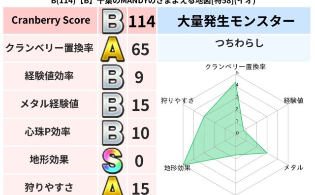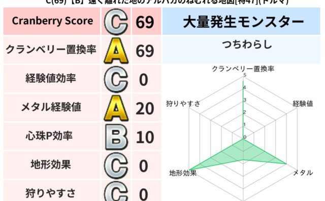 地図判定結果 C(73)【A】奈良のたいじののろいの地図[特54](ドルマ) クランベリーボット判定結果の詳細クランベリースコア:73クランベリー置換率:68%大量発生モンスター:つちわらしドルマ超耐性(74%)こころ道 完全一致モンスターフレイム守り人(ささえ道Lv5)デビルアーマー大神官(舞道Lv5)ヒートギズモ... 2023/12/04 01:35 地図判定結果