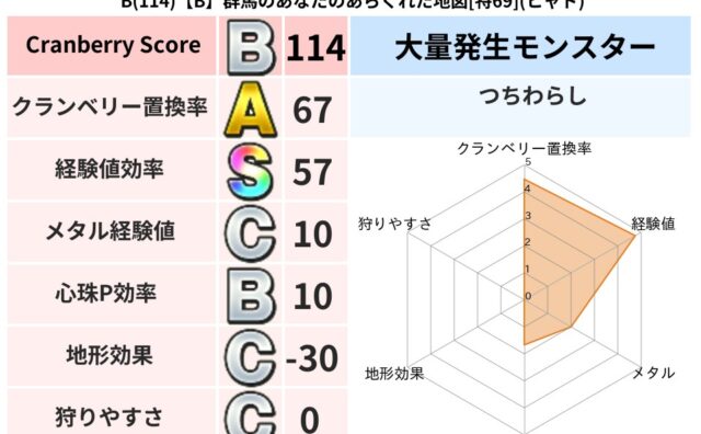 クランベリーボット判定結果の詳細クランベリースコア49クランベリー置換率66%大量発生モンスターつちわらし超耐性ギラ(60%)系統狩り怪人系43%こころ道 完全一致モンスターしりょうのきし大神官(舞道Lv5)かっちゅうアリ魔人(共通Lv1)...