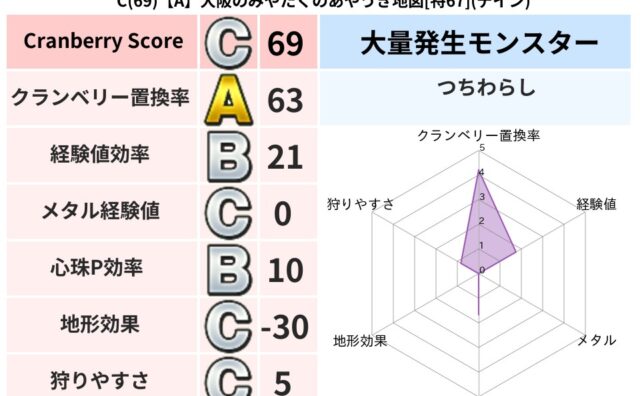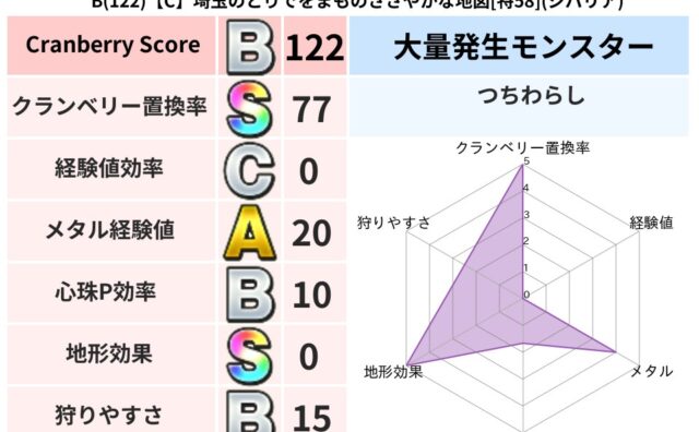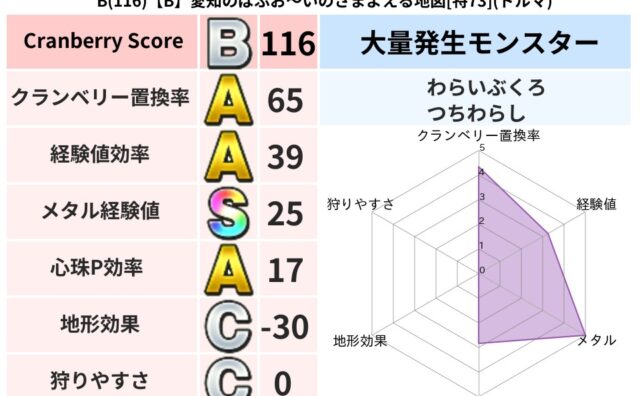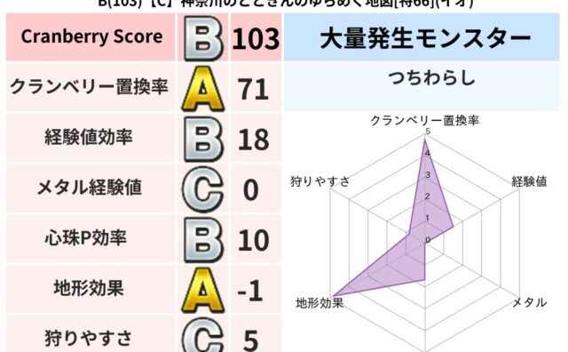 クランベリーボット判定結果の詳細クランベリースコア:115クランベリー置換率:50%大量発生モンスター:つちわらしイオ超耐性(8%)こころ道 完全一致モンスターヒートギズモ: 守り人(ささえ道Lv5)パペットマン: 天地雷鳴士(天道Lv5)...