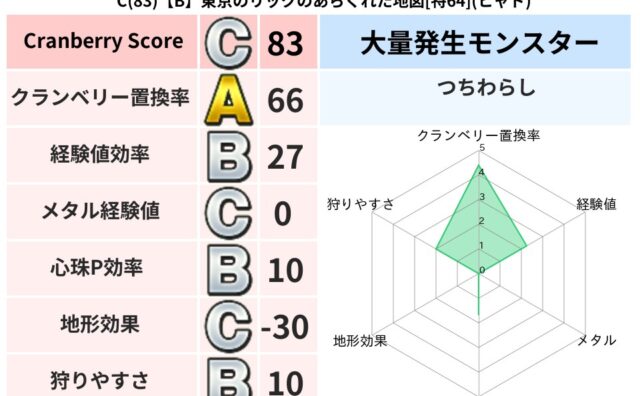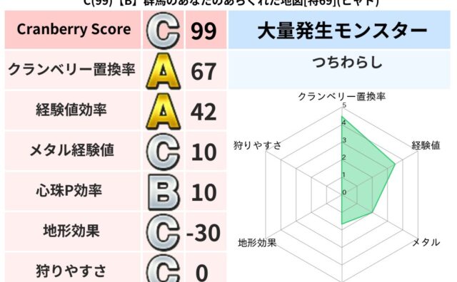 クランベリーボット判定結果の詳細クランベリースコア:83クランベリー置換率:66%大量発生モンスター:つちわらしヒャド超耐性(56%)系統狩り(48%)こころ道 完全一致モンスターかっちゅうアリ魔人(共通Lv1)おおさそりゴッドハンド(武道...