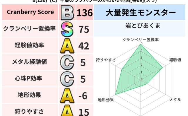 クランベリーボット判定結果の詳細クランベリースコア73クランベリー置換率60%大量発生モンスターマリンスライム,岩とびあくま超耐性ヒャド(40%)超耐性・弱耐性なしギラこころ道 完全一致モンスターベロニャーゴ大魔道士(理力道Lv5)かっちゅ...