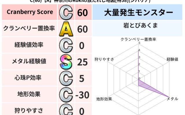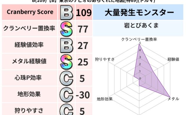 クランベリーボット判定結果の詳細クランベリースコア:135クランベリー置換率:69%大量発生モンスター:岩とびあくまドルマ超耐性(7%)こころ道 完全一致モンスターどくどくゾンビ: 魔剣士(共通Lv1)かっちゅうアリ: 魔人(共通Lv1)フ...