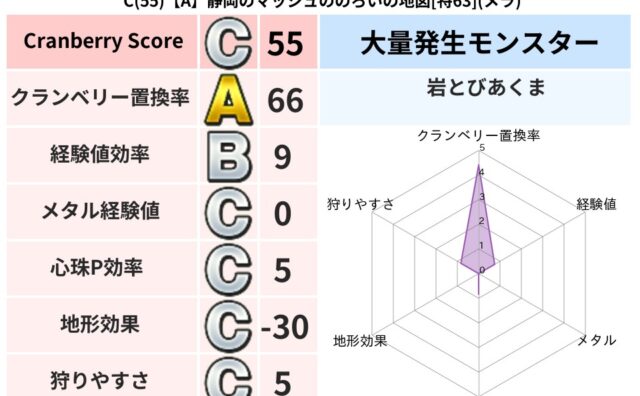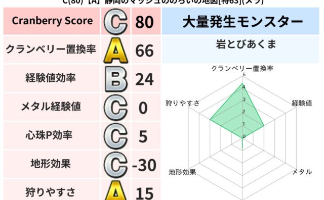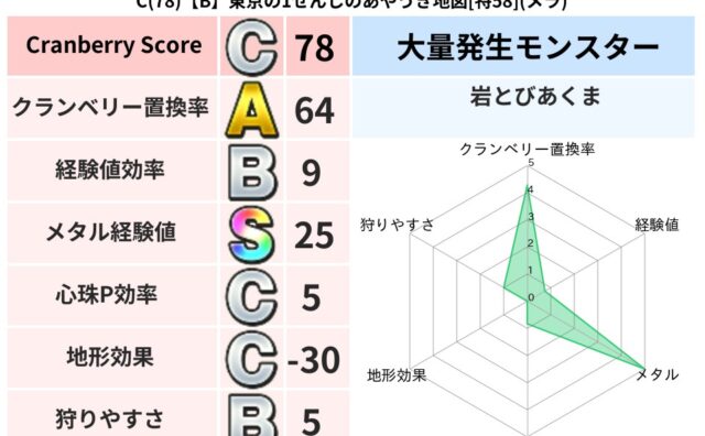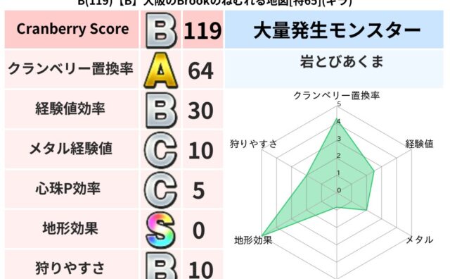 クランベリーボット判定結果の詳細クランベリースコア99クランベリー置換率60%大量発生モンスター岩とびあくま超耐性イオ(0%)超耐性・弱耐性なしジバリアこころ道 完全一致モンスターパペットマン天地雷鳴士(天道Lv5)つかいま大魔道士(理力道...
