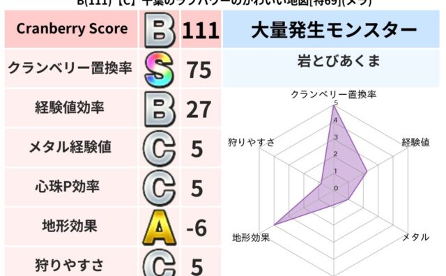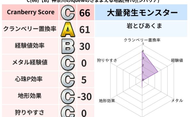 クランベリーボット判定結果の詳細クランベリースコア:88クランベリー置換率:60%大量発生モンスター:マリンスライム,岩とびあくまヒャド超耐性(40%)超耐性・弱耐性なし:ギラこころ道 完全一致モンスターベロニャーゴ大魔導士(理力道Lv5)...