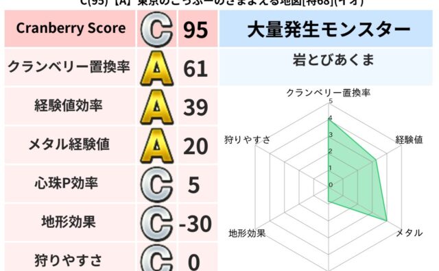 クランベリーボット判定結果の詳細クランベリースコア69クランベリー置換率64%大量発生モンスター岩とびあくま超耐性メラ(69%)超耐性・弱耐性なしイオこころ道 完全一致モンスターフレイム守り人(ささえ道Lv5)ストーンマンゴッドハンド(守護...