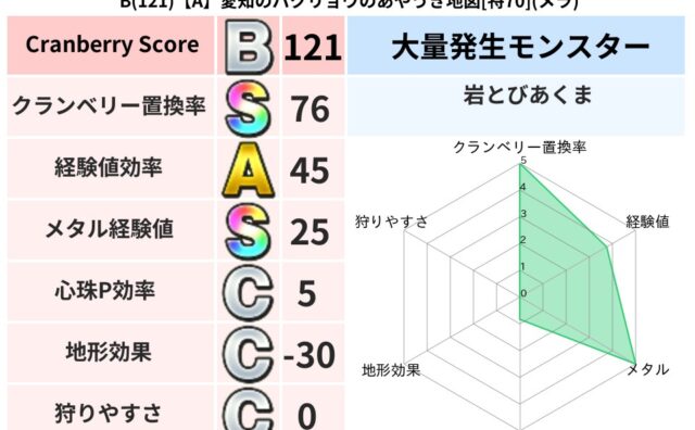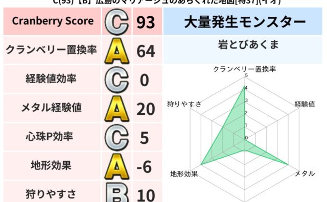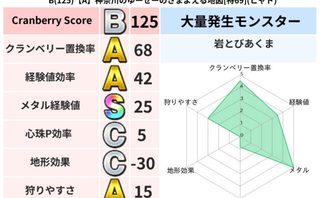 クランベリーボット判定結果の詳細クランベリースコア125クランベリー置換率68%大量発生モンスター岩とびあくま超耐性ヒャド(58%)超耐性・弱耐性なしジバリア系統狩り水系42%こころ道 完全一致モンスターヘルボックル魔剣士(魔道Lv30)リ...