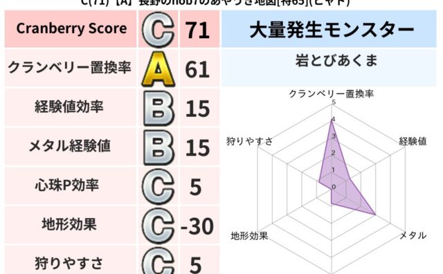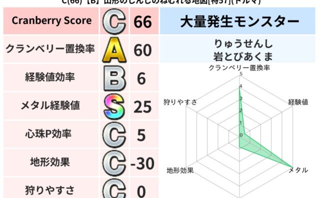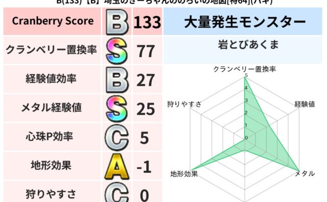 クランベリーボット判定結果の詳細クランベリースコア133クランベリー置換率77%大量発生モンスター岩とびあくま超耐性バギ(1%)こころ道 完全一致モンスターくさった死体ゴッドハンド(守護道Lv5)大魔道士(魔力道Lv5)ストーンマンゴッドハ...