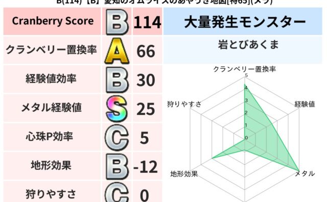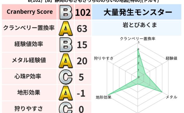 クランベリーボット判定結果の詳細クランベリースコア:102クランベリー置換率:63%大量発生モンスター:岩とびあくまドルマ超耐性(1%)こころ道 完全一致モンスターさまようよろいゴッドハンド(守護道Lv5)ストーンマンゴッドハンド(守護道L...