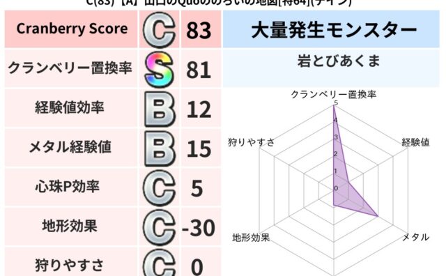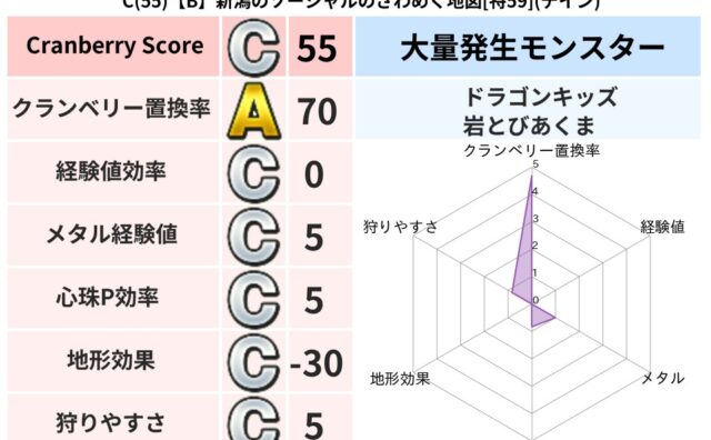 クランベリーボット判定結果の詳細クランベリースコア54クランベリー置換率79%大量発生モンスター岩とびあくま超耐性イオ(42%)こころ道 完全一致モンスターどくどくゾンビ魔剣士(共通Lv1)ヒートギズモ守り人(ささえ道Lv5)ストーンマンゴ...