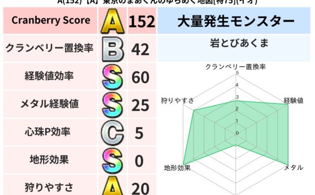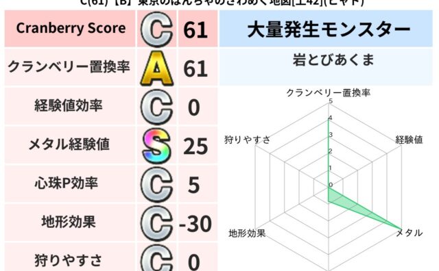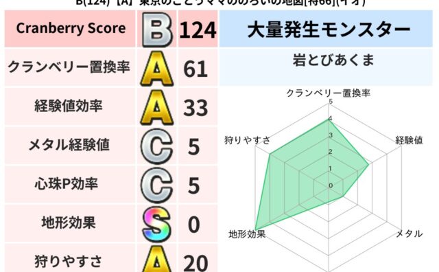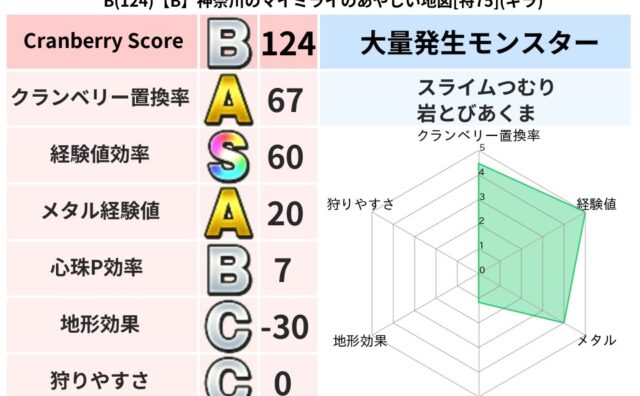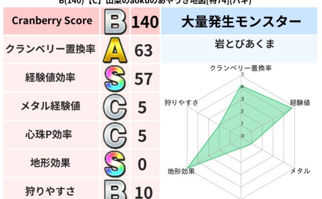 地図判定結果 B(140)【C】山梨のaokuのあやうき地図[特74](バギ) クランベリーボット判定結果の詳細クランベリースコア:140クランベリー置換率:63%大量発生モンスター:岩とびあくまバギ超耐性(0%)こころ道 完全一致モンスタースカルガルードラゴン(竜道Lv5)かっちゅうアリ魔人(共通Lv1)ぐんたいガニ... 2025/06/20 21:42 地図判定結果
