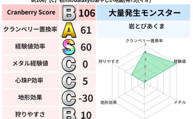 地図判定結果 B(106)【C】石川のGalaxyのあやしい地図[特75](イオ) クランベリーボット判定結果の詳細クランベリースコア:106クランベリー置換率:61%大量発生モンスター:岩とびあくまイオ超耐性(69%)系統狩り(42%)こころ道 完全一致モンスターキャットフライニンジャ(共通Lv1)かっちゅうアリ魔人(共... 2025/07/02 19:00 地図判定結果