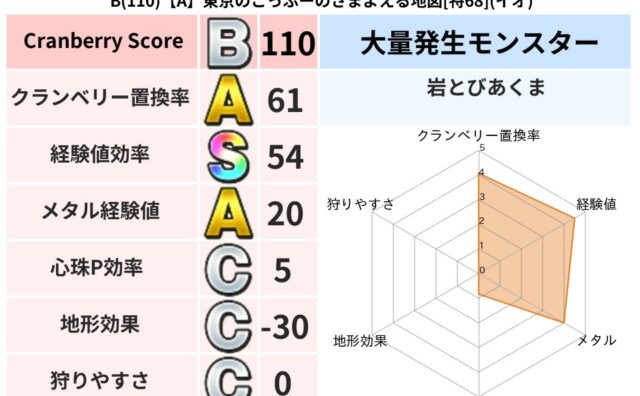 クランベリーボット判定結果の詳細クランベリースコア151クランベリー置換率51%大量発生モンスターマリンスライム,岩とびあくま,あらくれチャッピー超耐性メラ(0%)こころ道 完全一致モンスターねこまどうニンジャ(風道Lv5)しりょうのきし大...