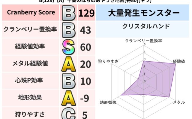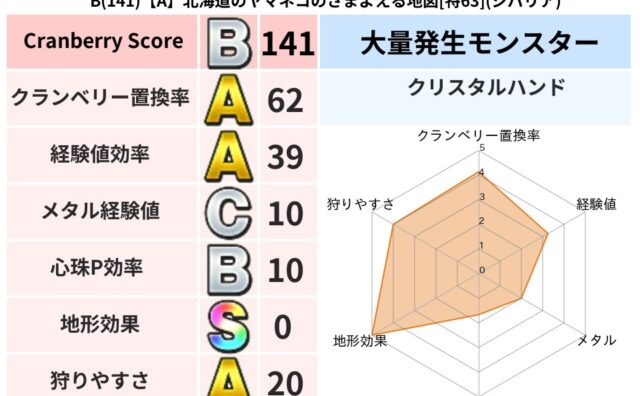 クランベリーボット判定結果の詳細クランベリースコア152クランベリー置換率57%大量発生モンスタースライムつむり,クリスタルハンド超耐性デイン(0%)系統狩り物質系49%こころ道 完全一致モンスターばくだん岩大神官(舞道Lv5)ストーンマン...