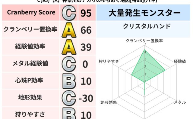 クランベリーボット判定結果の詳細クランベリースコア70クランベリー置換率66%大量発生モンスタークリスタルハンド超耐性バギ(56%)系統狩りゾンビ系41%こころ道 完全一致モンスターヒートギズモ守り人(ささえ道Lv5)デンタザウルス大神官(...