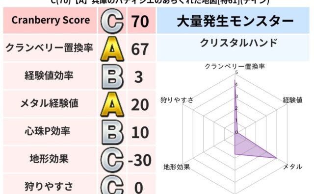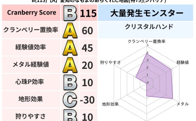 クランベリーボット判定結果の詳細クランベリースコア74クランベリー置換率69%大量発生モンスタークリスタルハンド超耐性デイン(54%)系統狩りエレメント系53%こころ道 完全一致モンスタードロヌーバニンジャ(波道Lv5)フレイム守り人(ささ...