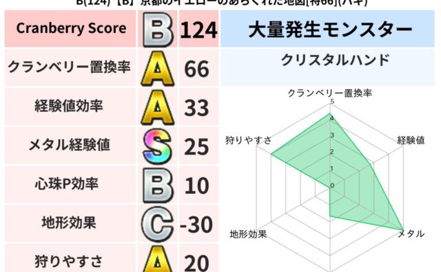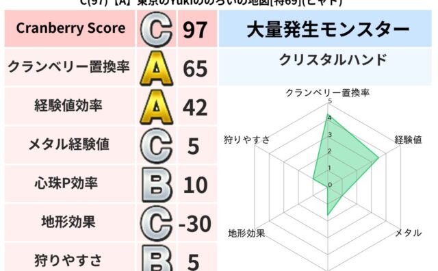 クランベリーボット判定結果の詳細クランベリースコア74クランベリー置換率64%大量発生モンスタークリスタルハンド超耐性メラ(53%)こころ道 完全一致モンスターヘルボックル魔剣士(魔道Lv30)ひとくいばこ魔剣士(刃道Lv10)テンツク大魔...