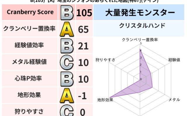 クランベリーボット判定結果の詳細クランベリースコア105クランベリー置換率65%大量発生モンスタークリスタルハンド超耐性デイン(1%)こころ道 完全一致モンスターキメラ大魔道士(共通Lv1)ヘルボックル魔剣士(魔道Lv30)キースドラゴン大...