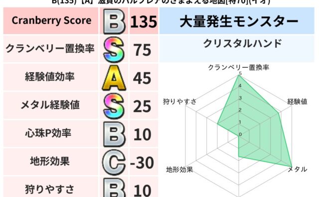 地図判定結果 B(135)【A】滋賀のバルフレアのさまよえる地図[特70](イオ) クランベリーボット判定結果の詳細クランベリースコア:135クランベリー置換率:75%大量発生モンスター:クリスタルハンドイオ超耐性(86%)系統狩り(44%)こころ道 完全一致モンスターかっちゅうアリ魔人(共通Lv1)ベビーサラマンダ大神官... 2025/08/29 07:56 地図判定結果置換率S