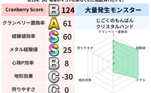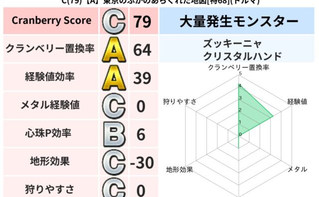 地図判定結果 C(79)【A】東京のふかのあらくれた地図[特68](ドルマ) クランベリーボット判定結果の詳細クランベリースコア:79クランベリー置換率:64%大量発生モンスター:ズッキーニャ,クリスタルハンドドルマ超耐性(49%)こころ道 完全一致モンスターストーンマンゴッドハンド(守護道Lv5)アイアンクック守り... 2025/07/29 19:30 地図判定結果