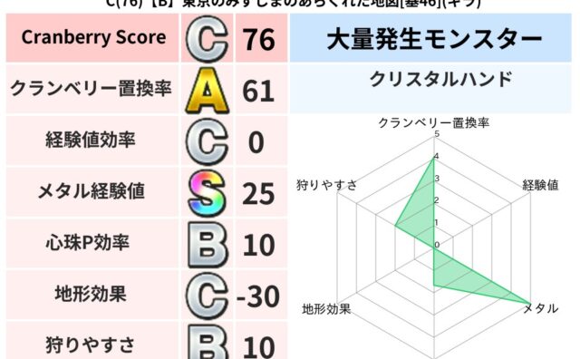 地図判定結果 C(76)【B】東京のみずしまのあらくれた地図[基46](ギラ) クランベリーボット判定結果の詳細クランベリースコア:76クランベリー置換率:61%大量発生モンスター:クリスタルハンドギラ超耐性(47%)系統狩り(42%)こころ道 完全一致モンスターがいこつ魔剣士(共通Lv1)かっちゅうアリ魔人(共通Lv... 2025/08/16 23:25 地図判定結果