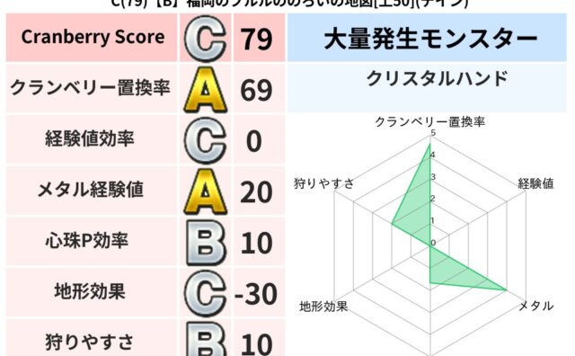 クランベリーボット判定結果の詳細クランベリースコア:79クランベリー置換率:69%大量発生モンスター:クリスタルハンドデイン超耐性(54%)系統狩り(53%)こころ道 完全一致モンスタードロヌーバニンジャ(波道Lv5)フレイム守り人(ささえ...