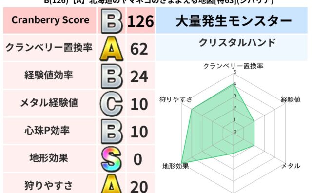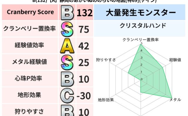 クランベリーボット判定結果の詳細クランベリースコア113クランベリー置換率71%大量発生モンスタークリスタルハンド,スライムつむり超耐性ギラ(11%)こころ道 完全一致モンスターかっちゅうアリ魔人(共通Lv1)しりょうのきし大神官(舞道Lv...