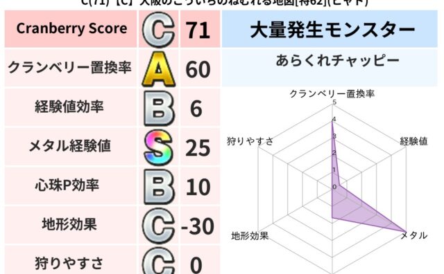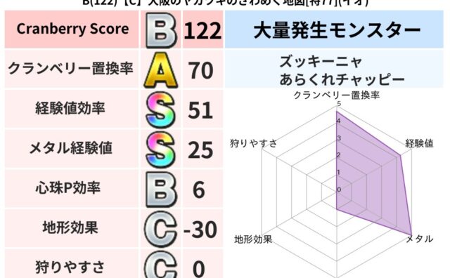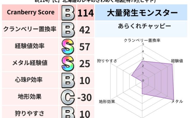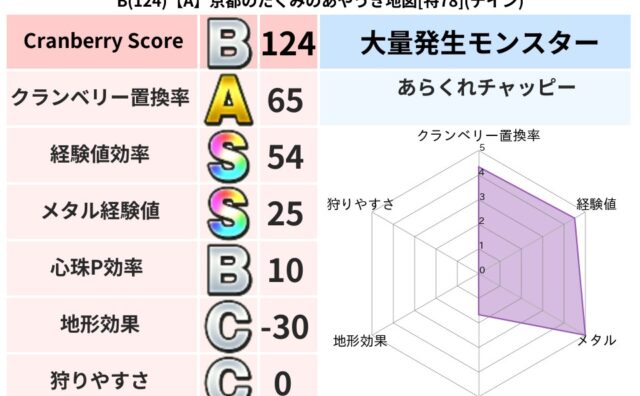 クランベリーボット判定結果の詳細クランベリースコア124クランベリー置換率65%大量発生モンスターあらくれチャッピー超耐性デイン(76%)系統狩りけもの系41%こころ道 完全一致モンスターブラウニー守り人(共通Lv1)デビルアーマー大神官(...