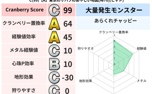 クランベリーボット判定結果の詳細クランベリースコア93クランベリー置換率70%大量発生モンスターメトロゴースト,あらくれチャッピー超耐性デイン(31%)超耐性・弱耐性なしバギこころ道 完全一致モンスターギズモ天地雷鳴士(共通Lv1)ブラウニ...