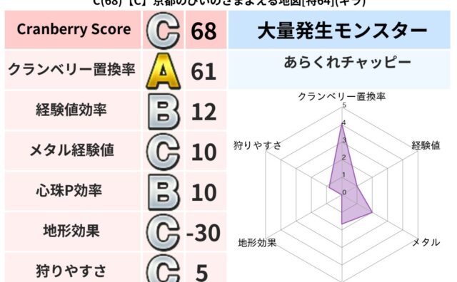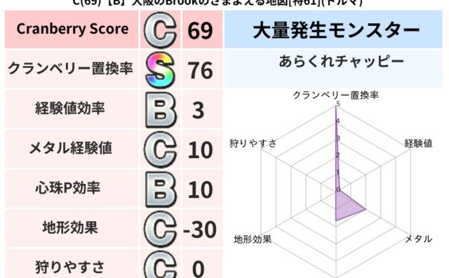 クランベリーボット判定結果の詳細クランベリースコア84クランベリー置換率64%大量発生モンスターあらくれチャッピー超耐性ヒャド(85%)こころ道 完全一致モンスターがいこつ魔剣士(共通Lv1)フレイム守り人(ささえ道Lv5)かっちゅうアリ魔...