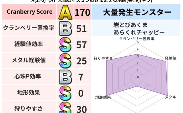 クランベリーボット判定結果の詳細クランベリースコア114クランベリー置換率42%大量発生モンスターあらくれチャッピー超耐性ヒャド(56%)超耐性・弱耐性なしバギ系統狩りけもの系53%こころ道 完全一致モンスターベロニャーゴ大魔道士(理力道L...