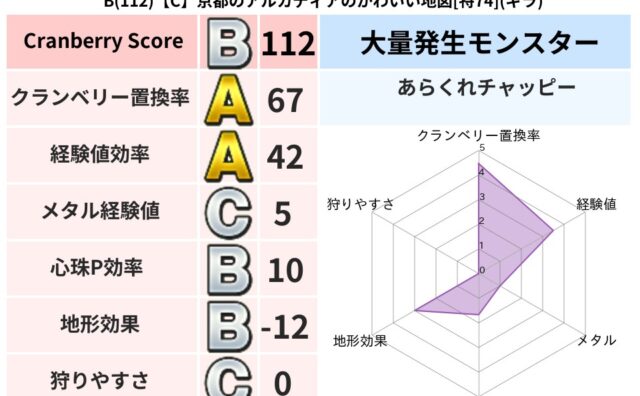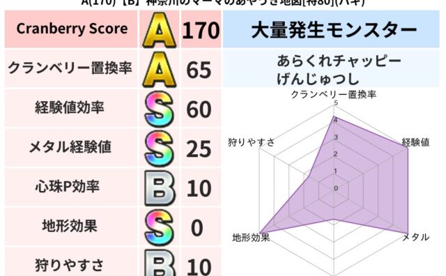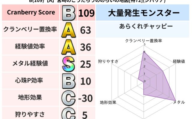 クランベリーボット判定結果の詳細クランベリースコア143クランベリー置換率38%大量発生モンスターメーダロード,あらくれチャッピー超耐性イオ(0%)超耐性・弱耐性なしバギこころ道 完全一致モンスターどくイモムシニンジャ(波道Lv5)がいこつ...