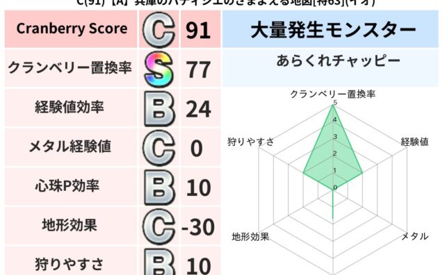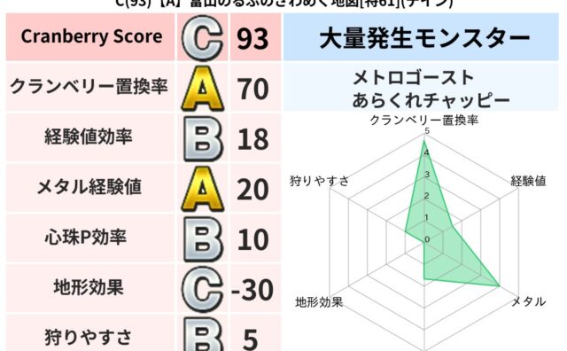 地図判定結果 C(93)【A】富山のるぷのざわめく地図[特61](デイン) クランベリーボット判定結果の詳細クランベリースコア93クランベリー置換率70%大量発生モンスターメトロゴースト,あらくれチャッピー超耐性デイン(31%)超耐性・弱耐性なしバギこころ道 完全一致モンスターギズモ天地雷鳴士(共通Lv1)ブラウニ... 2024/12/17 00:44 地図判定結果