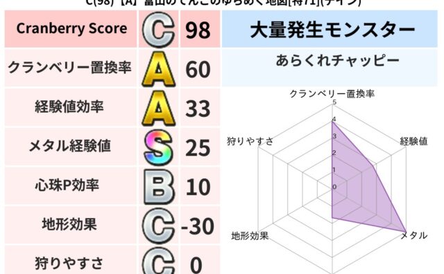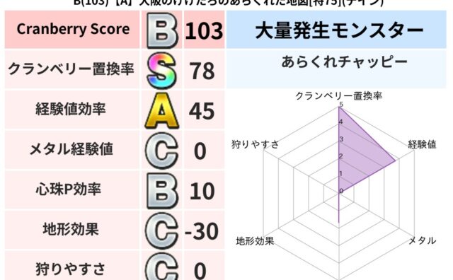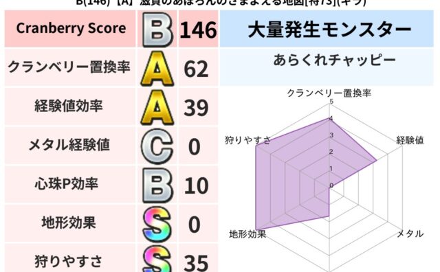 クランベリーボット判定結果の詳細クランベリースコア98クランベリー置換率60%大量発生モンスターあらくれチャッピー超耐性デイン(72%)こころ道 完全一致モンスターデビルアーマー大神官(舞道Lv5)たてまじん魔剣士(魔道Lv10)じごくのよ...