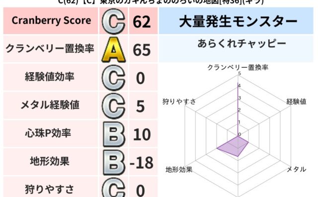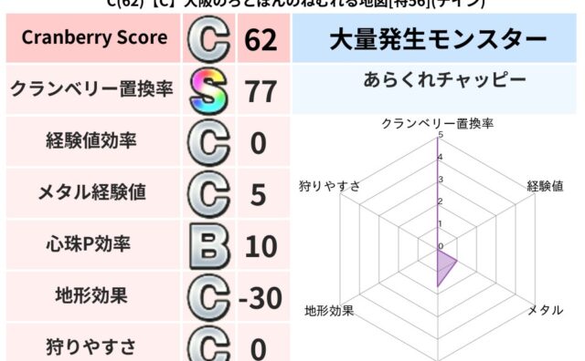 クランベリーボット判定結果の詳細クランベリースコア:75クランベリー置換率:77%大量発生モンスター:あらくれチャッピーデイン超耐性(79%)系統狩り(45%)こころ道 完全一致モンスターキャットフライニンジャ(共通Lv1)ストーンマンゴッ...